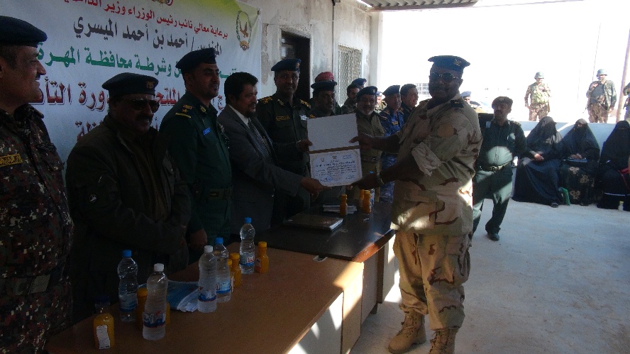 ومن جانبه قال العميد عبد العزيز الجابري نائب مدير شرطة المهرة ان هذه الدورات هي رفد جديد لهذه المحافظة الغالية على قلوبنا وعبر عن شكره لجميع ابناء المهرة الذين يقفون دائما الى جانب الامن والاستقرار والتعاون الامني في هذه المحافظة .