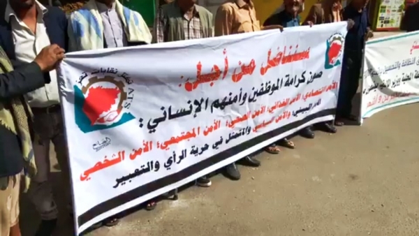 نظم العشرات من الموظفين في مدينة تعز، اليوم الخميس، وقفة احتجاجية على استمرار انقطاع رواتبهم منذ نحو عام.