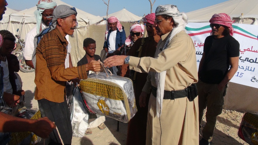 دشنت لجنة الإعتصام السلمي مشروع توزيع بطانيات الشتاء لنازحي إعصار لبان في محافظة المهرة .