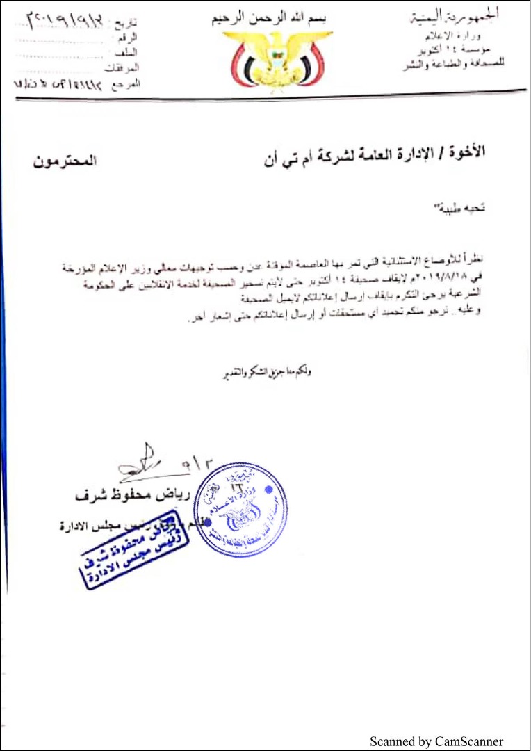 وكان القائم بأعمال رئيس مجلس الادارة رياض محفوظ شرف قد أصدر مذكرة يخاطب فيها شركة ( MTN ) بالتوقف عن ارسال اعلاناتها لايميل الصحيفة وتجميد اي استحقاقات حتى اشعار آخر .. مبررا ذلك بالاوضاع الاستثنائية التي تعيشها عدن وحتى لا يتم تسخير الصحيفة لخدمة الانقلابيين على الحكومة - حسب صيغة المذكرة .