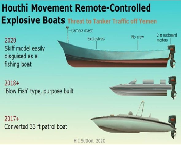 وقالت فوربس: "حتى الآن تمت السيطرة على نماذج القوارب الحوثية الموجهة عن بُعد. ووفقا للغة البحرية تعتبر هذه سفن سطحية غير مأهولة. كما أن نماذج الحوثي يطلق عليها أيضا الأجهزة المتفجرة المرتجلة المنقولة عن طريق المياه".