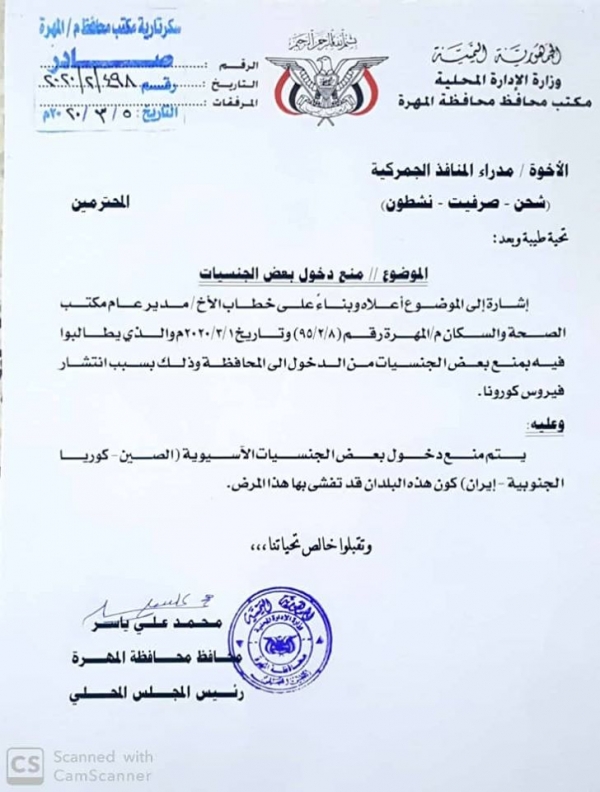 وأصدر المحافظ تعميم إلى مدراء المنافذ الجمركية يقضي بحظر دخول الوافدين من بعض الجنسيات الآسيوية وخاصة من الدول الموبوءة بفيروس كورونا.
