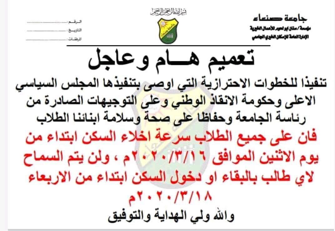 وقالت إدارة السكن الخيري (الخاضعة لسيطرة الميليشيا) في تعميم نُشر في وقت متأخر من مساء الأحد أن "على جميع الطلاب سرعة إخلاء السكن يوم الاثنين الموافق 2020/3/16، محذرة أنه لن يتم السماح لأي طالب بالبقاء داخل السكن بعد تأريخ 2020/3/18".
