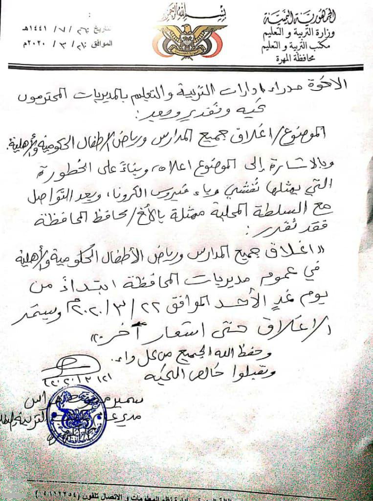 اصدر مكتب التربية التعليم في محافظة المهرة اليمنية تعميما الي كافة مدراء التربية بالمحافظة بإغلاق كافة المدراس الاهلية والحكومية ابتداءًا من اليوم الاحد.