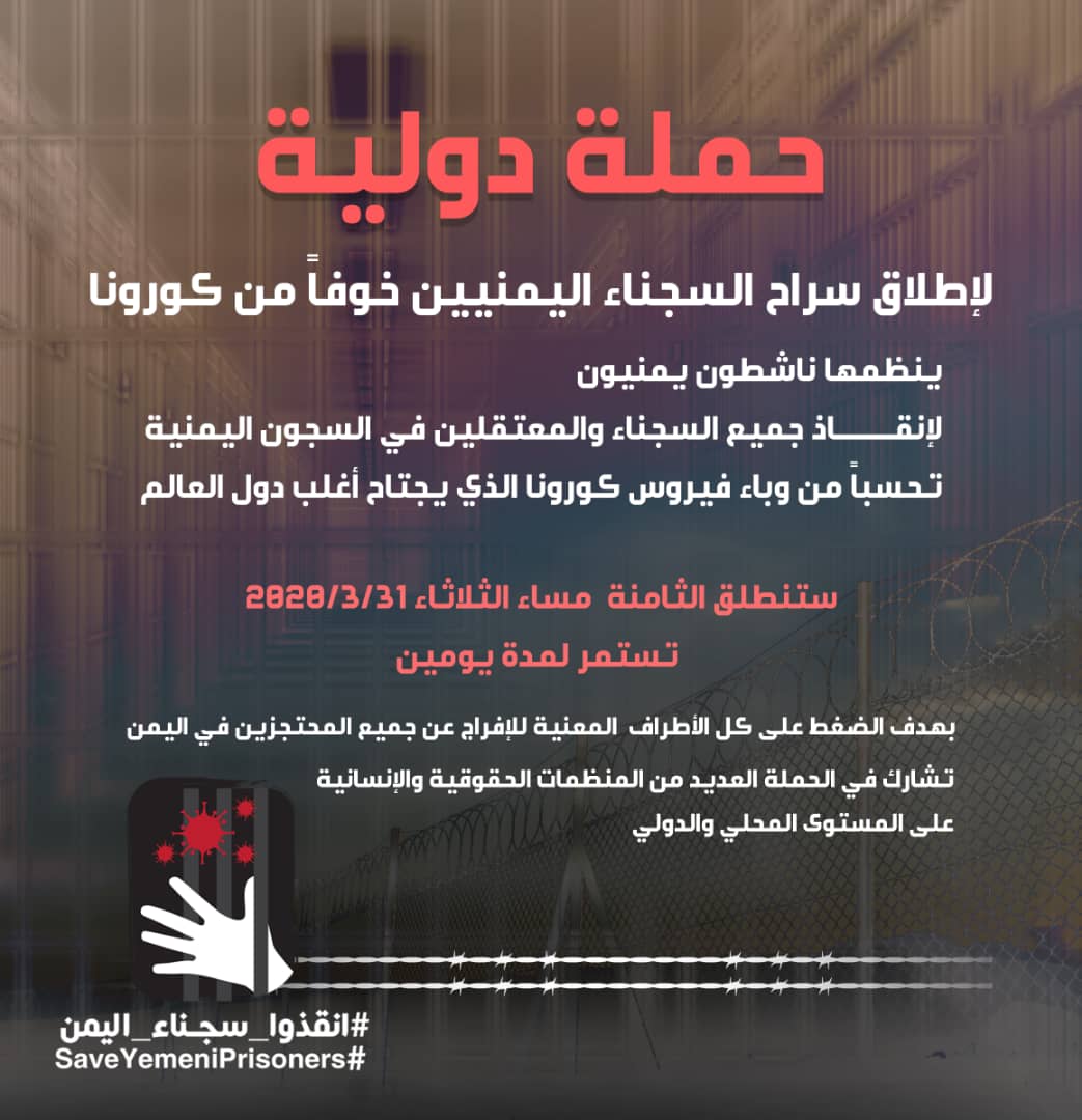 أعلن ناشطون يمنيون اليوم الثلاثاء، عن إطلاق حملة الكترونية واسعة، لإنقاذ جميع السجناء والمعتقلين في السجون اليمنية، تحسباً لتفشي فيروس كورونا الذي يجتاح أغلب دول العالم.