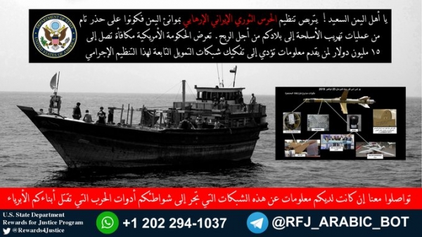 أعلنت الخارجية الأمريكية، اليوم الخميس، عن مكافأة تصل إلى" 15 مليون دولار" لمن يقدم معلومات تؤدي إلى تفكيك شبكات التهريب والتمويل التابعة للحرس الثوري الإيراني في اليمن.