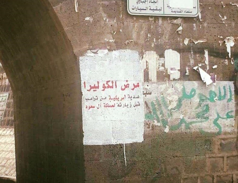 استباقاً لإعلان وجود أية إصابات بفيروس كورونا (كوفيد 19) في اليمن، حملت قيادات حوثية كلاً من السعودية وأمريكا مسؤولية انتشار هذا الفيروس في اليمن، وما زالت جدران صنعاء تحمل عبارة "الكوليرا هدية أمريكية" حتى اللحظة.