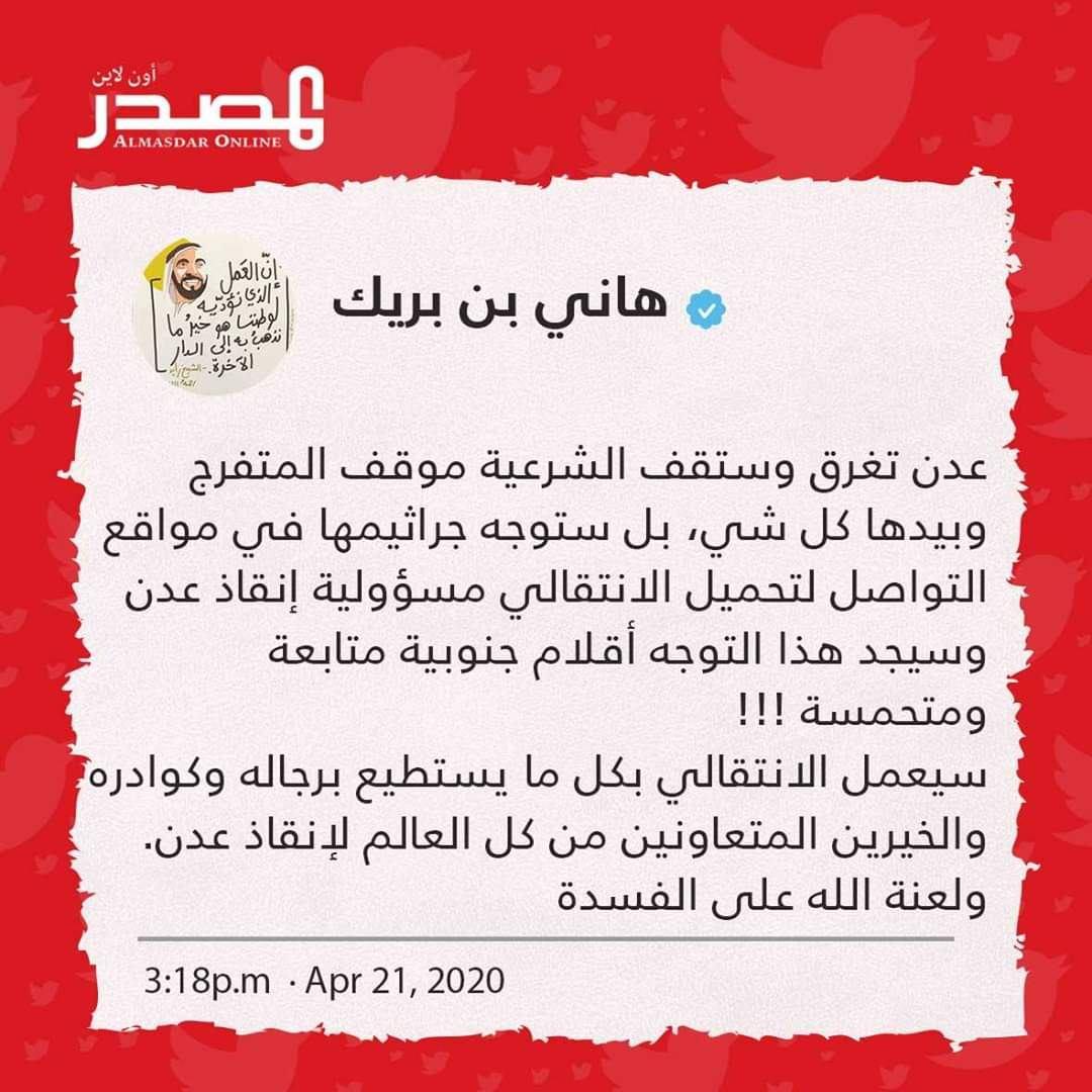 وقال نائب الانتقالي هاني بن بريك في تغريدة له على تويتر: " عدن تغرق وستقف الشرعية موقف المتفرج وبيدها كل شي، بل ستوجه جراثيمها في مواقع التواصل لتحميل الانتقالي مسؤولية إنقاذ عدن وسيجد هذا التوجه أقلام جنوبية متابعة ومتحمسة !!!".