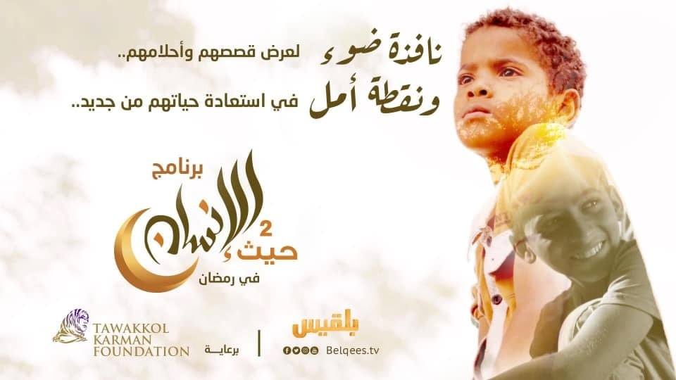 أعلنت قناة "بلقيس" الفضائية عن برنامجها "حيث الإنسان" المسابقاتي الخيري الجزء الثاني خلال شهر رمضان المبارك والذي يهدف إلى تسليط الضوء على معاناة قطاع واسع من اليمنيين جراء الحرب المدمرة التي تشهدها البلاد منذ خمسة أعوام.