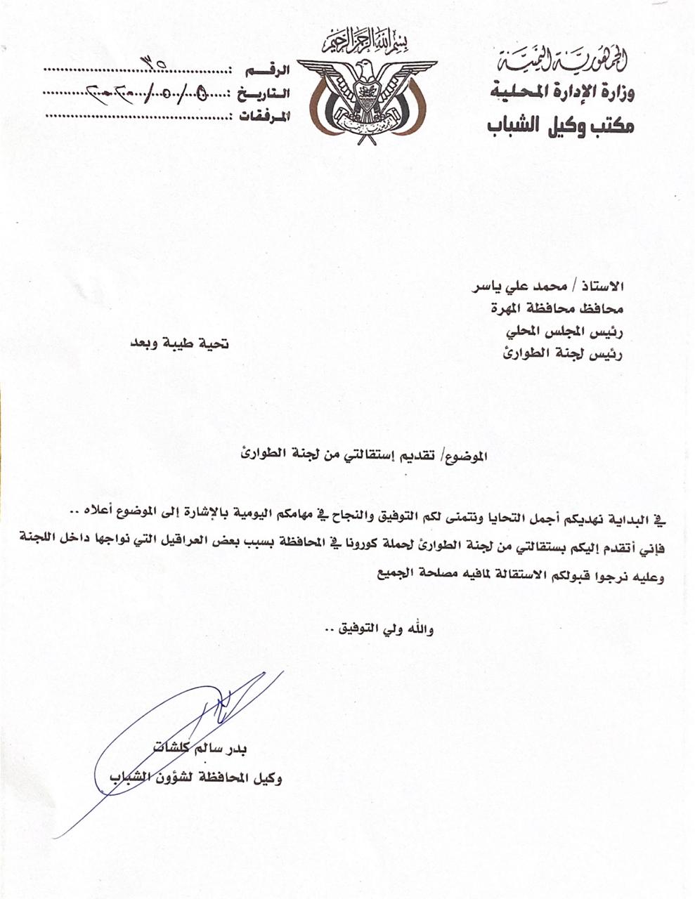 قدم عضو لجنة الطوارىء في محافظة المهرة لمواجهة كورونا ورئيس الحملة وكيل المحافظة بدر كلشات استقالته من اللجنة والحملة .