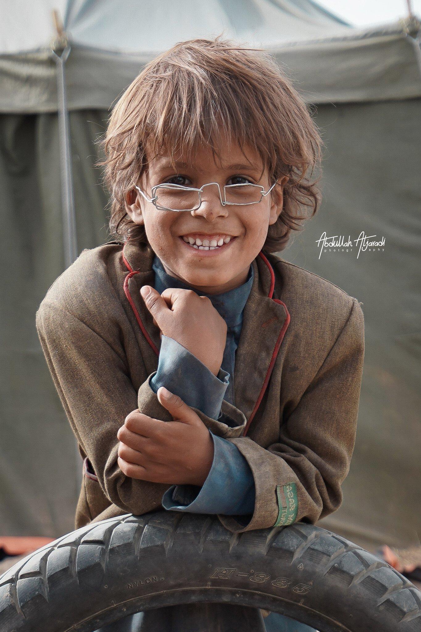 ونشر الجرادي صورة الطفل وهو مرتدياً نظارته، وقال إن "الطفل محمد، نازح بسبب الحرب التقيناه اليوم (الإثنين الماضي) وأهدانا أغلى ما يفخر به أمام أصدقائه وهي (النظارة) الذي صنعها بيده، مقابل إنه نصوره".
