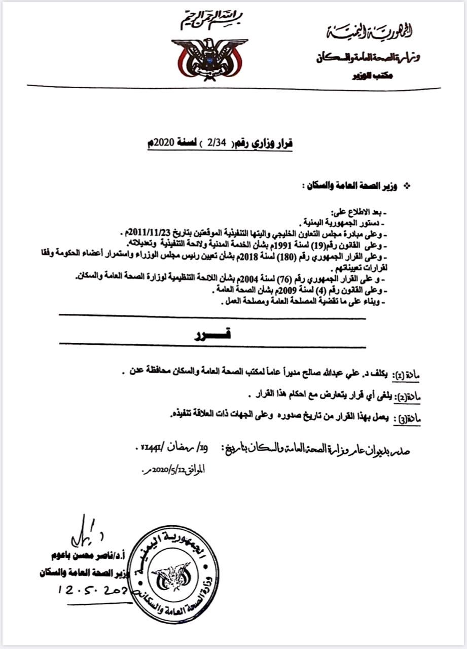 اصدرت وزارة الصحة العامة والسكان قرارا وزاريا بتعين مديرا جديدا لممتب الصحة العامة والسكان في العاصمة المؤقتة عدن .
