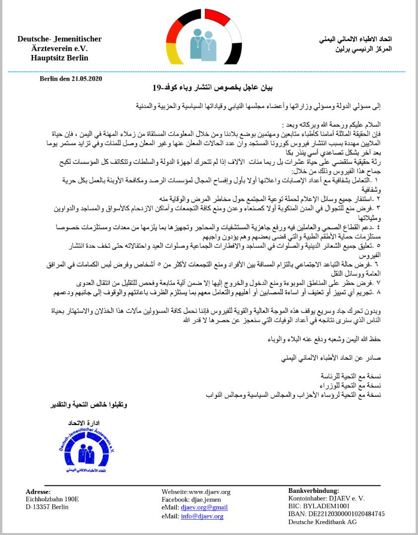 مركز اتحاد الأطباء الألماني اليمني يصدر بيانا عاجلا بخصوص انتشار وباء كوفيد 19