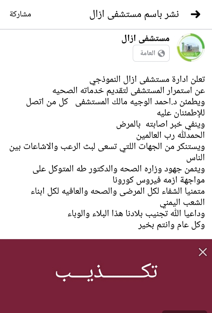 أعلنت ادارة مستشفى آزال بالعاصم صنعاء على صفحتها في الفيس بوك ان المستشفى مستمراً في عمله لتقديم خدماتة الطبية والصحية ..