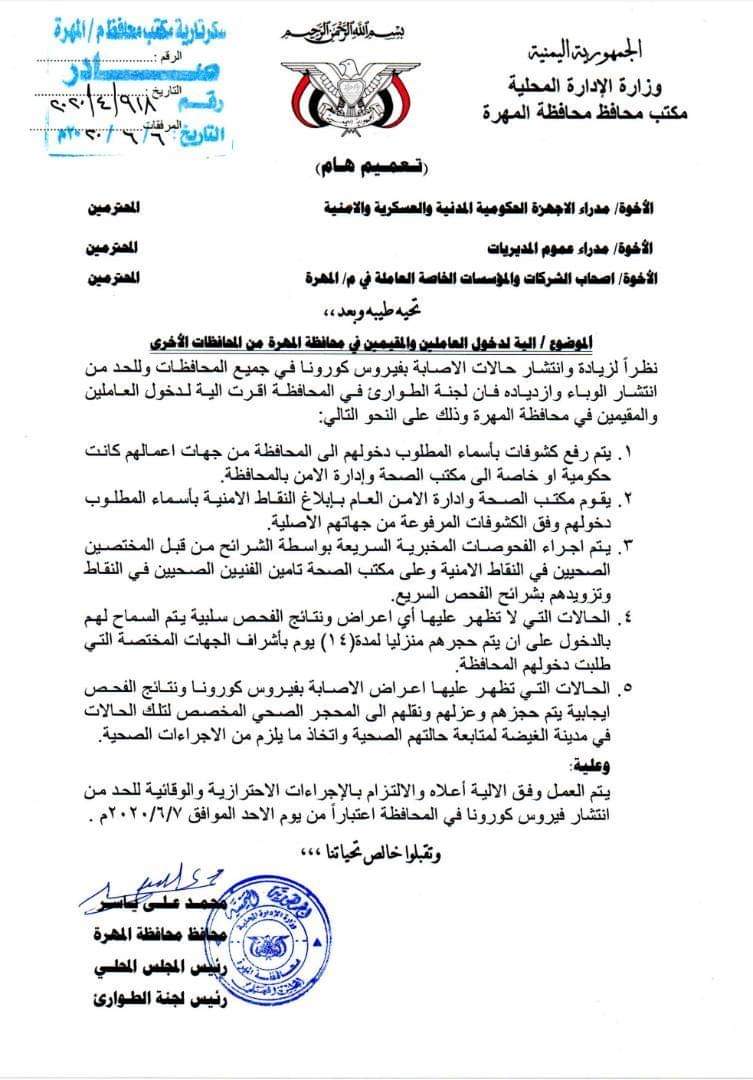 أقرت لجنة الطوارى بالمهرة، آلية لتنظيم دخول العاملين والمقيمين في المحافظة من المحافظات الأخرى.