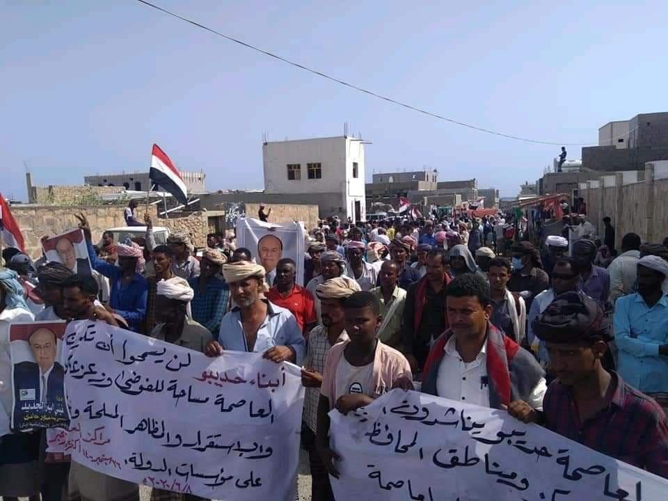 وخرج المواطنون في مظاهرة حاشدة بمديرية "حديبوه" عاصمة محافظة أرخبيل سقطرى، تأييدا للرئيس عبدربه منصور هادي ورفضاً للإدارة الذاتية التي أعلنها المجلس الانتقالي الجنوبي المدعوم إماراتياً.