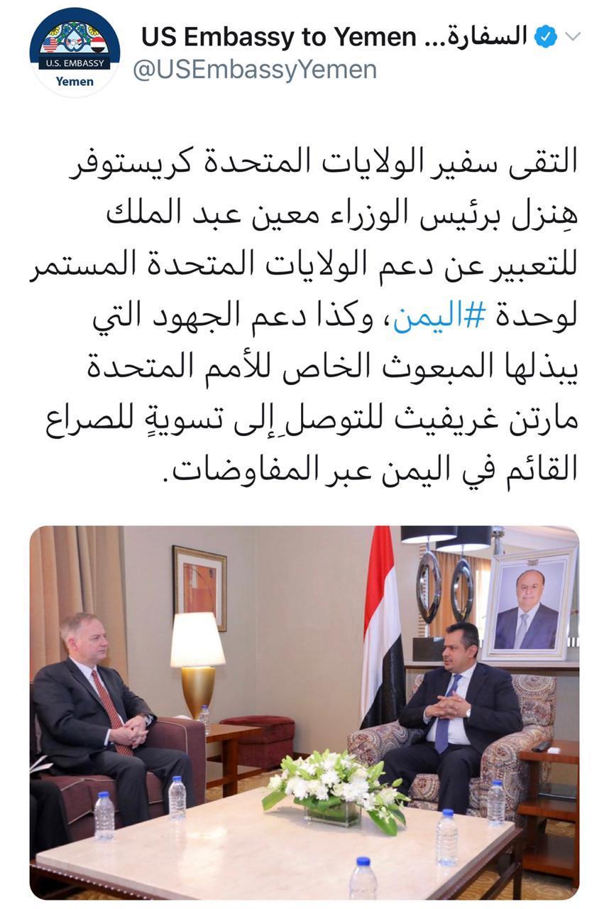 وفي حسابها على تويتر قالت السفارة الأمريكية أن سفير الولايات المتحدة كريستوفر هِنزل التقى برئيس الوزراء معين عبد الملك للتعبير عن دعم الولايات المتحدة المستمر لوحدة اليمن، وكذا دعم الجهود التي يبذلها المبعوث الخاص للأمم المتحدة مارتن غريفيث للتوصل إلى تسوية للصراع القائم في اليمن عبر المفاوضات.
