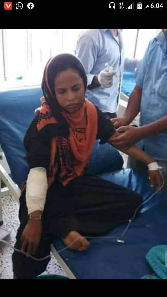 اصيبت الطفلة سباء محمد احمد الليث البالغة من العمر 12 عام ظهر اليوم الاربعاء الموافق2020/7/1 بطلق ناري قناصة بذراعها الأيمن أثناء امام منزلهم بمنطقة الخرازة شمال الفاخر.