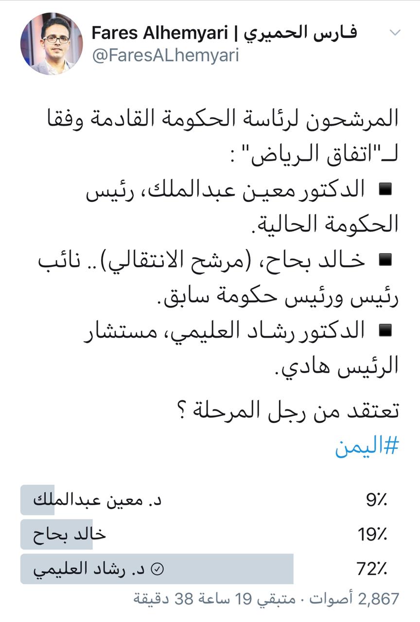 وحصد الدكتور رشاد العليمي غالبية أصوات المشاركين في الاستطلاع، الذي نشره مراسل وكالة شينخوا الصينية في اليمن فارس الحميري، بـ 70.3% من الأصوات التي تجاوزت 4900 مشارك.