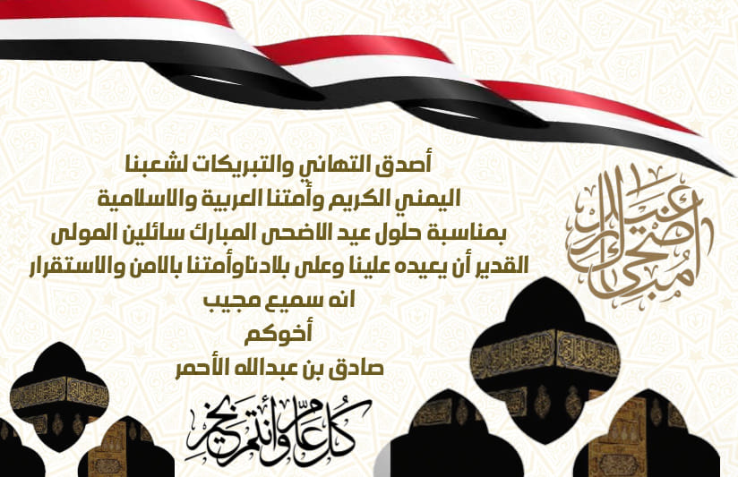 هنأ الشيخ صادق بن عبدالله بن حسين الأحمر الشعب اليمني والأمتين العربية والإسلامية بحلول عيد الأضحى المبارك.