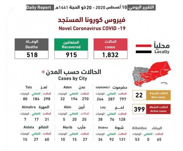 ويرتفع إجمالي الحالات المؤكدة منذ العاشر من إبريل الماضي إلى 1826 حالة منها 518 حالة وفاة، و915 حالة تعافي، ولا تشمل هذه الحصيلة المناطق التي تسيطر عليها ميلشيات الحوثي الانقلابية، حيث ترفض الإفصاح عن أي بيانات بشأن الوباء.