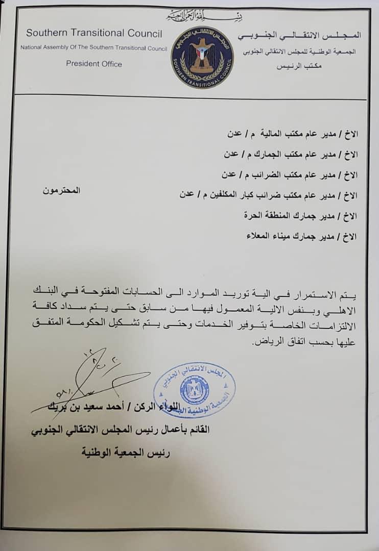 وحسب وثيقة موجهة إلى مكاتب المالية والجمارك والضرائب في العاصمة عدن فإنه تقرر العودة بتوريد العائدات إلى حسابات الإدارة الذاتية في البنك الأهلي حسب الآلية السابقة التي اعتمدها الانتقالي.