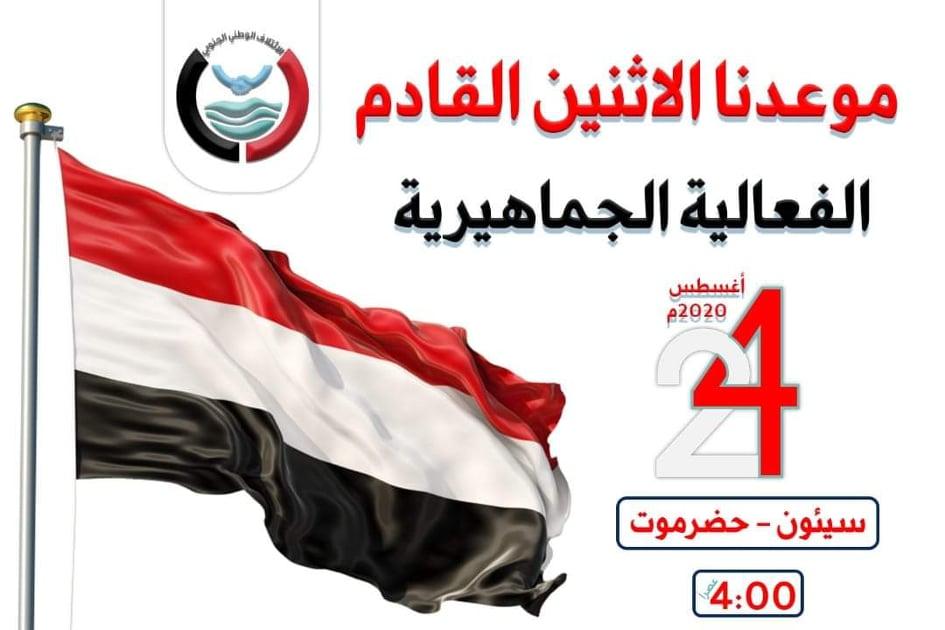 دعا الائتلاف الوطني الجنوبي، اليوم السبت، أبناء محافظة حضرموت (الوادي والصحراء) للمشاركة في الاحتشاد المليوني بمدينة سيئون عصر يوم الاثنين المقبل، 24 أغسطس2020م.