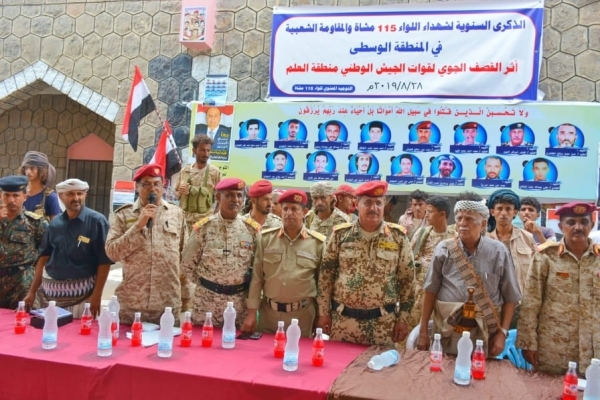 نظمت قيادة اللواء 115 مشاة في مديرية لودر شمال شرق محافظة أبين، حفلا تأبينيا بمناسبة الذكرى السنوية الأولى لشهداء اللواء والمقاومة الشعبية الذين استشهدوا جراء القصف الجوي الإماراتي على قوات الجيش الوطني في منطقة العلم شرق العاصمة المؤقتة عدن.