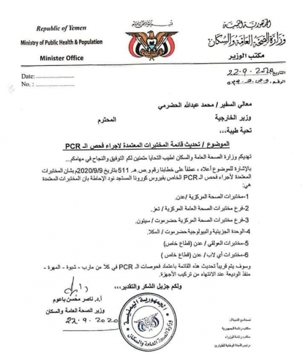 وأوضحت، في مذكرة وجّهتها لوزارة الخارجية، أن المختبرات المعتمدة حالياً لإجراء الفحوصات المتعلقة بفيروس كورونا هي مختبرات الصحة العامة المركزية في عدن وتعز وسيئون بالإضافة إلى مختبرات خاصة في عدن.