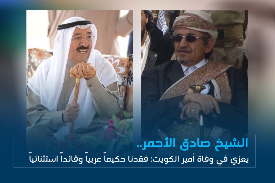 بعث الشيخ صادق بن عبدالله بن حسين الأحمر برقية عزاء ومواساة إلى صاحب السمو الشيخ نواف الأحمد الجابر الصباح وذلك في وفاة الشيخ صباح الأحمد الصباح أمير دولة الكويت الذي وافاه الأجل المحتوم بعد حياة حافلة بخدمة وطنه وأمته.