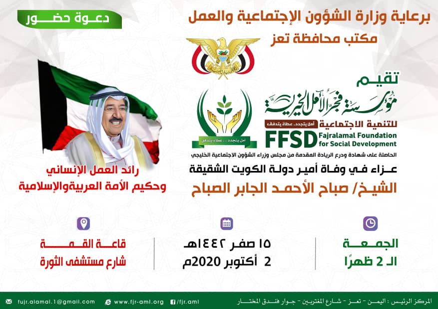 وبرعاية وزارة الشئون الإجتماعية والعمل مكتب محافظة تعز مساء اليوم الجمعة بمدينة تعز فعالية عزاء في وفاة أمير دولة الكويت سمو الشيخ/صباح الأحمد الجابرالصباح"