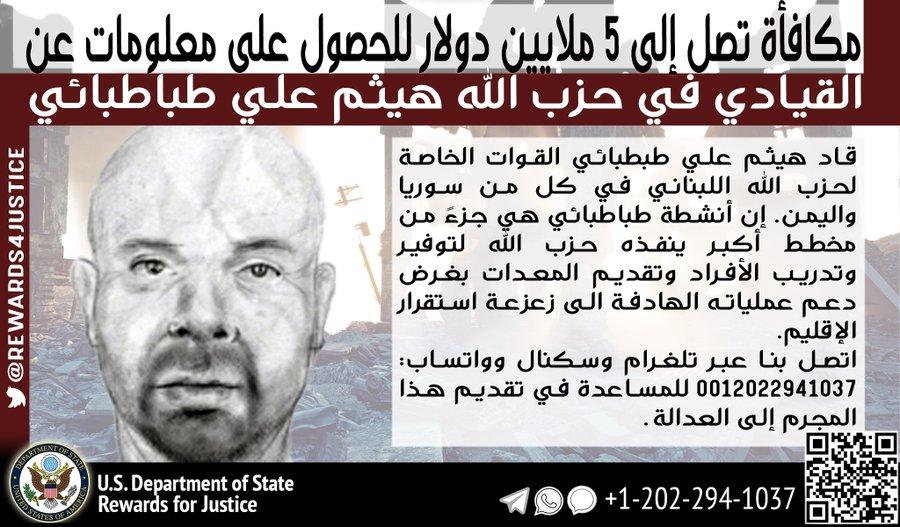 وقال برنامج "مكافآت من اجل العدالة" التابع لوزارة الخارجية الأمريكية، في حسابه على تويتر إن هيثم علي طبطبائي قاد القوات الخاصة التابعة لحزب الله اللبناني في كل من سوريا واليمن.