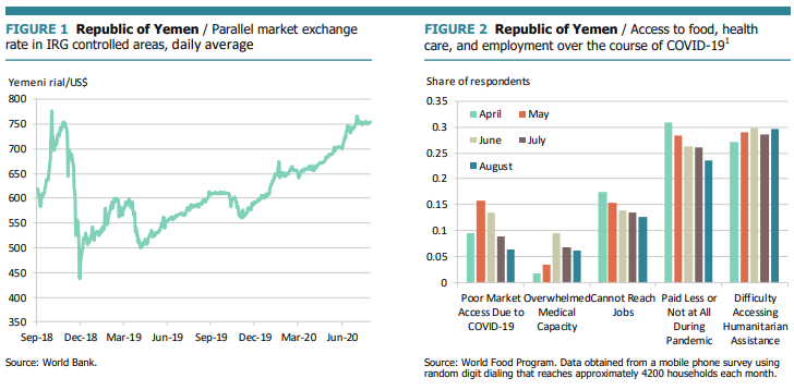 ويشير تقرير البنك الدولي، إلى "تعمق النقص في العملات الأجنبية بشكل أكبر مع شبه استنفاد تسهيلات تمويل الواردات الأساسية التي اودعتها المملكة العربية السعودية ، وانخفاض صادرات النفط ، وتقليص المساعدات الإنسانية"ولفت إلى "توفير بعض مساحة التنفس من خلال صندوق النقد الدولي لاحتواء الكوارث وإغاثتها"، وقال إن "الاتجاهات في تحويلات (المغتربين) غير واضحة لكنها كانت مقلقة بالفعل قبل جائحة كورونا بسبب تأثير أسعار النفط الضعيفة على اقتصادات دول مجلس التعاون الخليجي وزيادة التركيز على برامج توطين الوظائف في هذه الاقتصادات".