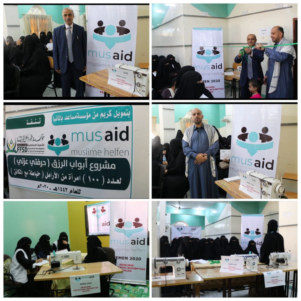 بحضور مديرعام مكتب الشئون الإجتماعية والعمل وبتمويل كريم من مؤسسة مساعد بألمانيا دشنت مؤسسة فجر الأمل الخيرية للتنمية الأجتماعية دورة تدريبية في مجال، الخياطة والتطريز لاربعين امراة من الأرامل، في مديريات المظفروالقاهرة وصالة بمدينة تعز ضمن برنامج حرفتي عزتي مشروع ابواب الرزق.