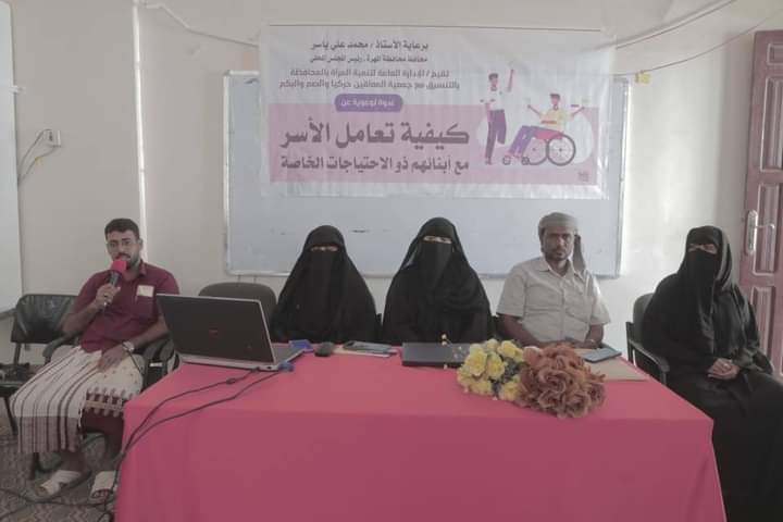 أقامت الإدارة العامة لتنمية المرأة بمحافظة المهرة، دورة توعوية عن كيفية تعامل الأسر مع أبنائهم من ذوي الاحتياجات الخاصة، بالتنسيق مع جمعية رعاية وتأهيل المعاقين حركياً وجمعية المهرة لرعاية الصم والبكم، برعاية الأستاذ محمد علي ياسر محافظ المحافظة.