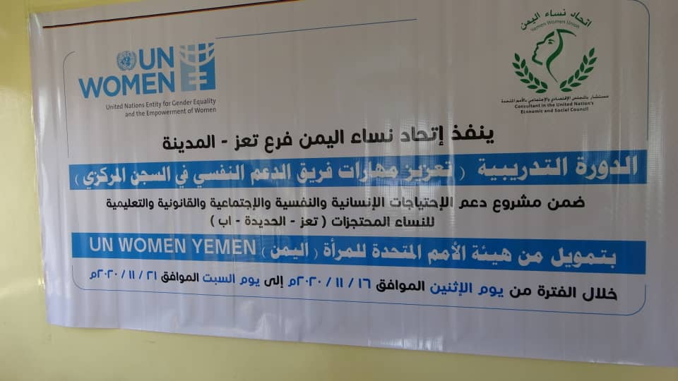 اقيمت في محافظة تعز الدورة التدريبيه في مجال تعزيز مهارات فريق الدعم النفسي للنساء المحتجزات في السجن المركزي والتى يقيمها اتحاد نساء اليمن فرع المدينه تعز ضمن مشروع دعم الاحتياجات الانسانية والنفسيه والاجتماعية والقانونية والتعليمية للنساء المحتجزات تعز - الحديدة -اب بتمويل من هئية الامم المتحدة للمراة اليمن من الفترة 16/11/2020موحتى تاريخ 21/11/2020م وقد تم افتتحها من مديرة الفرع الاستاذة صباح راجح والتى اكدت على اهمية الدورة من خلال رفع مهارات المتدربين في مراعاة ظروف السجينات والاهتمام بهم وفق مفاهيم علمية تعمل على اصلاحهن واخراجهن الى المجتمع نساء صالحات ويبدن حياة جديدة.. وقد كانت الاستاذة صباح كل يوم تزور وتناقش من المدربين والمتدربين السلبيات والاجابيات في الدورة