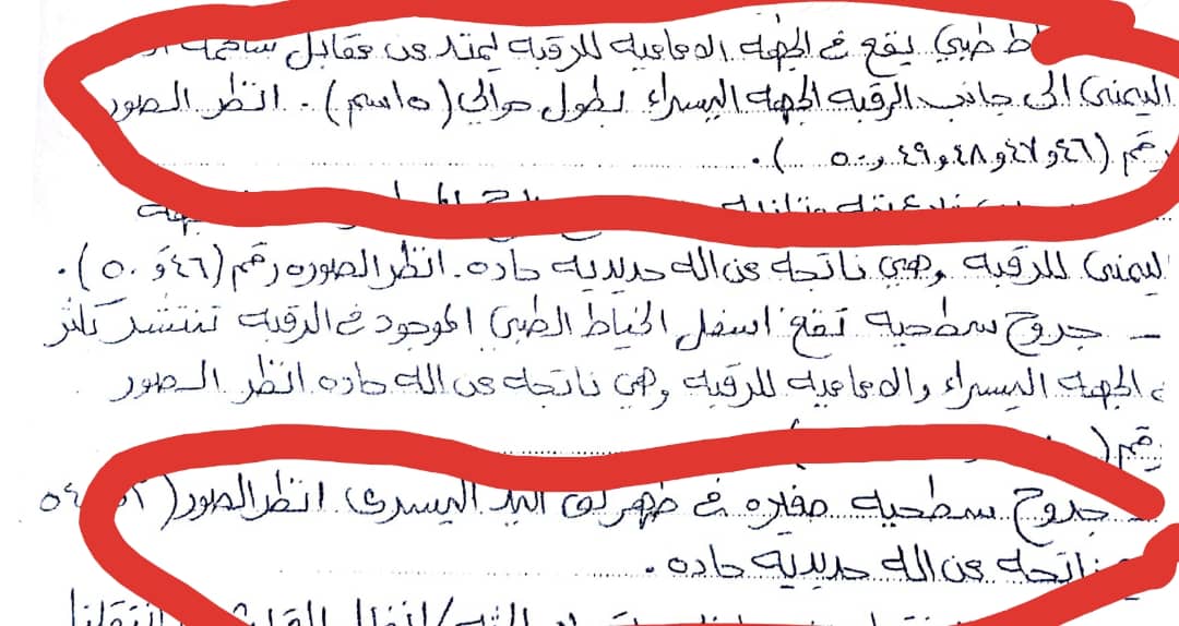 ففي الوقت الذي كان فيه يأمل الجميع من الطبيب الشرعي الذي يدعى ( ي . م . ع ) إيضاح الحالة النفسية للمتوفية وحقيقة قيامها بعملية الإجهاض او شربها لأي مادة او عقاقير ومعرفة أسباب الوفاة من خلال عملية التشريح في حالة عدم توصله لذلك حسب طلب الانتداب المرسل من قبل رئيس نيابة سيئون وغيرها من الأمور التي ستساعد في قطع الشك وإزالة اللبس حول الوفاة , الا انه سلم تقريراً بتاريخ 4/1/2020م تحت مسمى *الكشف الطبي الظاهري* - أي بمعنى خارجي للجثة فقط - بالرغم من ذلك الا انه ورد في ذلك التقرير العديد من الأمور التي تتطلب منه ضرورة قيامة بالتشريح ولو الجزئي او حتى قيامة بأشياء أخرى ان لم يقوم بها الحكم عليها اما لإثباتها او لنفيها , منها قياس *عمق وطول الجرح وحالة الانسجة والاوردة وكذا القصبة الهوائية* وغيرها من الاوصاف الواردة في تقريره *وادعا مشاهدة لذلك الجرح* الموجود في مقدمة رقبة المتوفية ووصفة طولة وعمقه وكذا *تفصيله لحالة الانسجة والاوردة والقصبة الهوائية بالتفصيل بالرغم من عدم قيامة بإزالة الخياط الطبي* الذي على رقبة المتوفية الذي عمل لها وقت اسعافها لمستشفى تريم مساء 24/12/2019م *ومن المستحيل وصف تلك الأشياء الا من خلال إزالة ذلك الخياط* ومما *يؤكد عدم قيامة بذلك الشي وفضحة , التقرير الصادر من قبل فريق الأدلة الجائية المنتدب من بحث ساحل حضرموت* بتاريخ *2/2/2020م* نظراً لعدم توفر بعض الإمكانيات لدى الأدلة الجنائية بوادي حضرموت وعدم مقدرتها القيام بالعديد من الأمور التي تساعد البحث وكذا النيابة في الوصول الى الحقيقة , تم الاستعانة بفريق من الأدلة الجنائية بساحل حضرموت والذين حضروا بتاريخ 18/1/2020م أي بعد انتداب الطبيب الشرعي واصدارة لذلك التقرير *ب 14 يوماً* وإعطاء الفريق المنتدب من بحث ساحل حضرموت تقريراً مفصلاً عن موقع الحادث وجثة المتوفية وكذا حكمة بانة يوجد على كف اليد *جروح ظفريه* واثباتها من قبل ادلة بحث ساحل حضرموت انها *جروح بأداة حادة* وغيرها من الأمور *اثبت عكسها تقرير الأدلة الجنائية بساحل حضرموت بالوثائق والصور* التي فضحت *كذب ذلك الطبيب وبطلان تقريره*.
