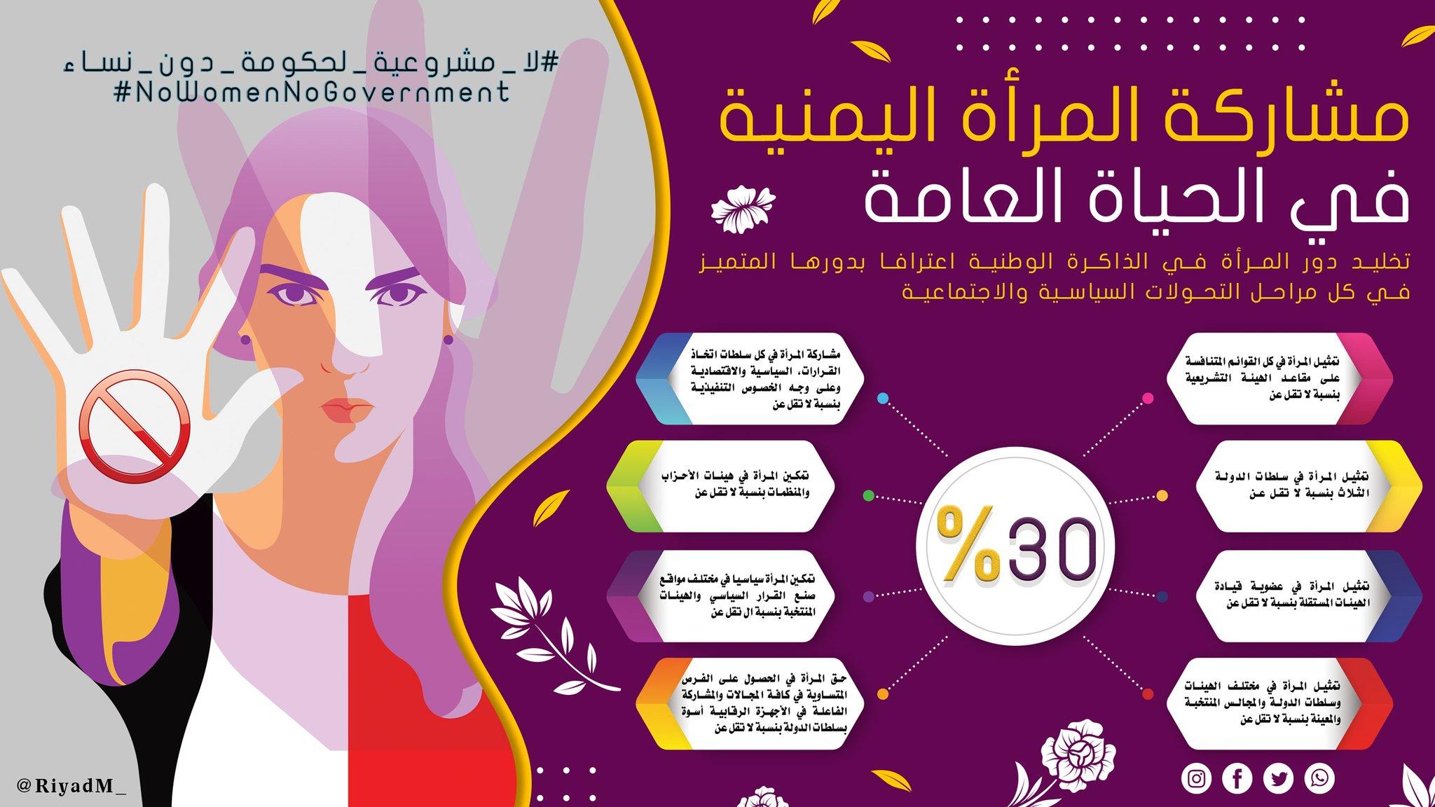 وأطلقت الناشطات على مواقع التواصل الاجتماعي أبرزهن وزيرتا حقوق الانسان والإعلام في حكومة الوفاق الوطني التي رأسها خالد بحاح "2014" حورية مشهور ونادية السقاف، هاشتاق "#لامشروعية_لحكومة_دون_نساء"، ليحظى بتفاعل كبير من النشطاء ودعم من شخصيات سياسية معروفة.