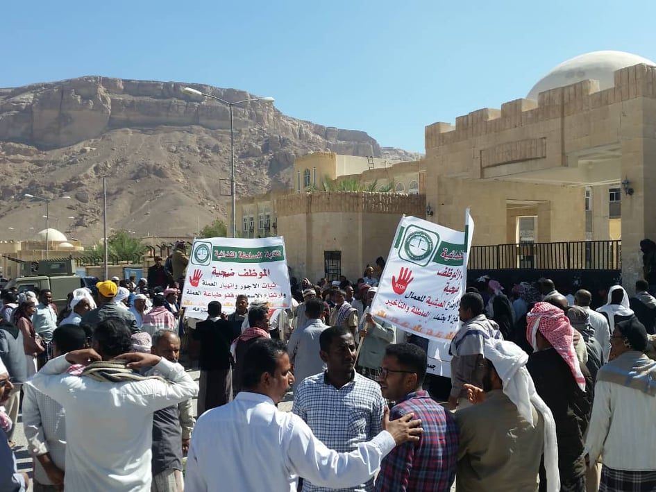 حيث رفع العشرات من موظفي الدولة الذين شاركوا في وقفة احتجاجية أمام المجمع الحكومي بمدينة سيئون احتجاجا على تدهور قيمة العملة المحلية وتدني الأجور.