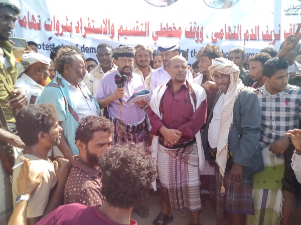 وحذّر المتظاهرون، من أي إقصاء أو تهميش لأبناء تهامة في الحكومة الجديدة، مشيرين إلى أن إقليم تهامة من أهم الأقاليم اليمنية ولايمكن القبول بإقصاء أبناءه من أي استحقاقات قادمة.