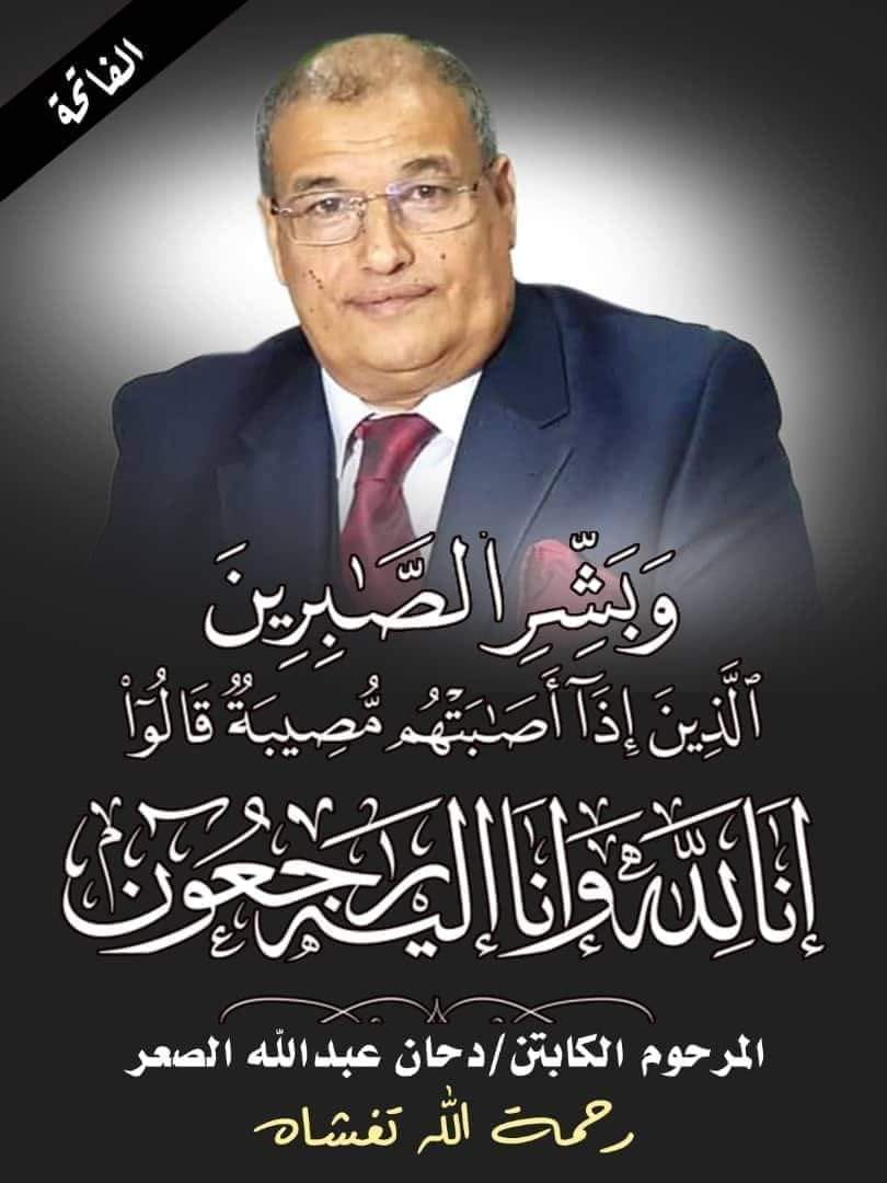 بعث الشيخ صادق بن عبدالله بن حسين الأحمر برقية عزاء ومواساة إلى الشيخ عبدالرحمن حزام الصعر وكافة آل الصعر الكرام وذلك في وفاة الكابتن طيار/ دحان بن عبدالله الصعر بعد حياة حافلة بخدمة الوطن.