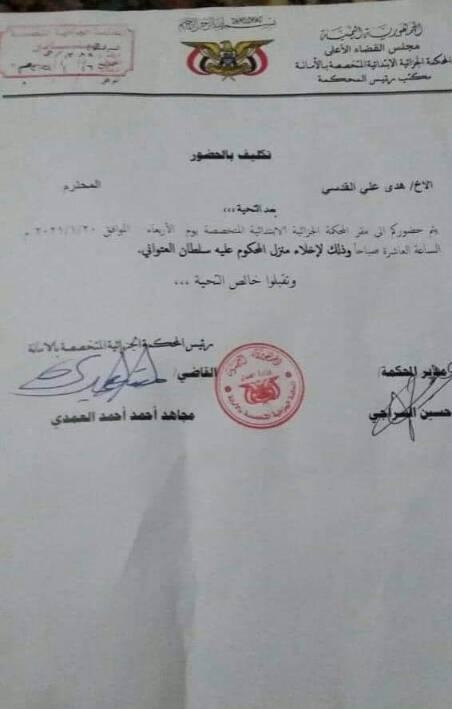ووجهت وثيقة صادرة عن المحكمة الجزائية المتخصصة التابعة للحوثيين في صنعاء، أطلّع عليها "يمن شباب نت"، الساكنين في المنزل بسرعة إخلائه.