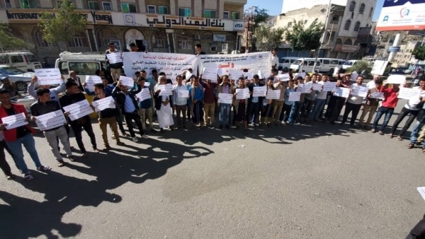 نظم العشرات من طلاب الجامعات الخاصة في مدينة تعز، الثلاثاء، وقفة احتجاجية للمطالبة بتخفيض الرسوم الدراسية.
