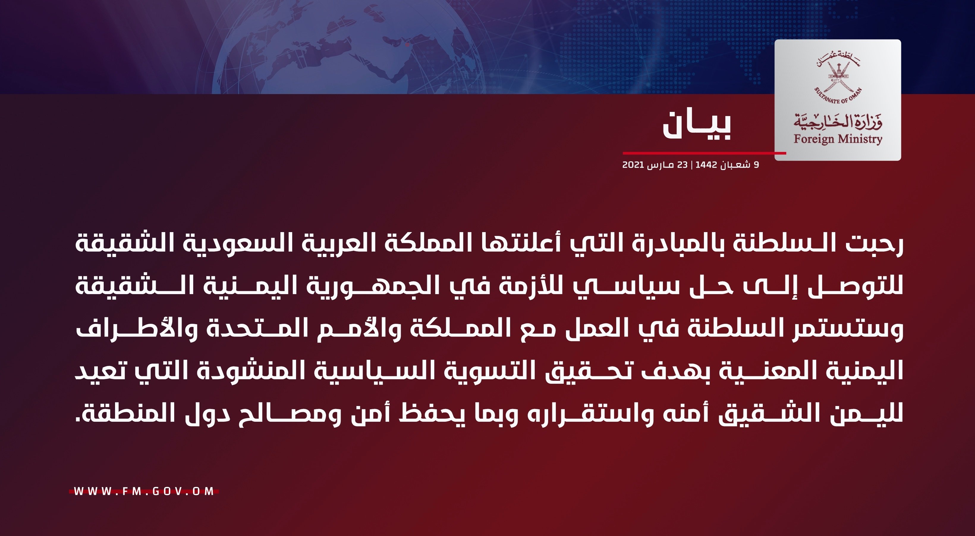 رحبت سلطنة عمان، اليوم الثلاثاء، بالمبادرة التي أعلنتها المملكة العربية السعودية يوم أمس للتوصل إلى حل سياسي للأزمة في اليمن.