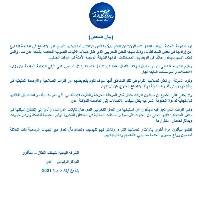 تود الشركة اليمنية للهاتف النقال "سبأفون" أن تتقدم أولًا بخالص الاعتذار لمشتركيها الكرام عن الانقطاع في الخدمة الخارج عن إرادتها في بعض المحافظات، وذلك نتيجة للعمل التخريبي الذي طال كابلات الألياف الضوئية الخاصة بشبكة عدن نت، والتي تعتمد عليها سبأفون حاليًا في الربط بين المحافظات؛ كونها الشبكة الوحيدة الآمنة في الوقت الحالي.