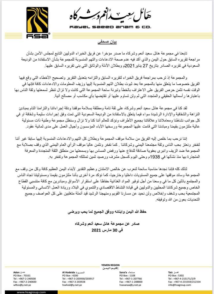 تابعنا في مجموعة هائل سعيد أنعم وشركاه ما صدر مؤخرا عن فريق الخبراء الدوليين التابع لمجلس الأمن بشأن مراجعة تقريره السابق حول اليمن والذي أكد فيه عدم صحة الادعاءات والتهم المنسوبة للمجموعة بشأن الاستفادة من الوديعة السعودية في تقريره الصادر بتاريخ 27 يناير2021م وبطلان الأدلة والوثائق التي بنى تقريره السابق عليها.