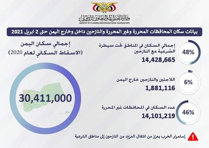 جاء ذلك في "انفوجرافيك" نشره موقع الوزارة على الإنترنت، تضمن بيانات سكان المحافظات المحررة وغير المحررة والنازحين داخل وخارج اليمن حتى الثاني من أبريل الجاري.