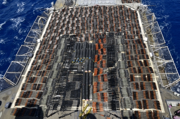 وفي وقت سابق الأحد، أعلنت البحرية الأمريكية، أنها صادرت شحنة أسلحة مؤلفة من آلاف الأسلحة الهجومية والمدافع الرشاشة وبنادق القنص مخبأة على متن سفينة في بحر العرب كانت متجهة على ما يبدو إلى اليمن لدعم المتمردين الحوثيين في البلاد.