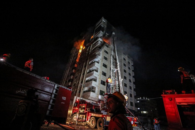 وفي وقت سابق السبت، دمرت طائرات الاحتلال برج الجلاء، الذي يضم مقر شبكة الجزيرة في غزة ووسائل إعلام أخرى، مثل وكالة "أسوشيتد برس" (Associated Press) الأميركية، كما يضم 60 شقة سكنية ومكاتب لمحامين وأطباء.