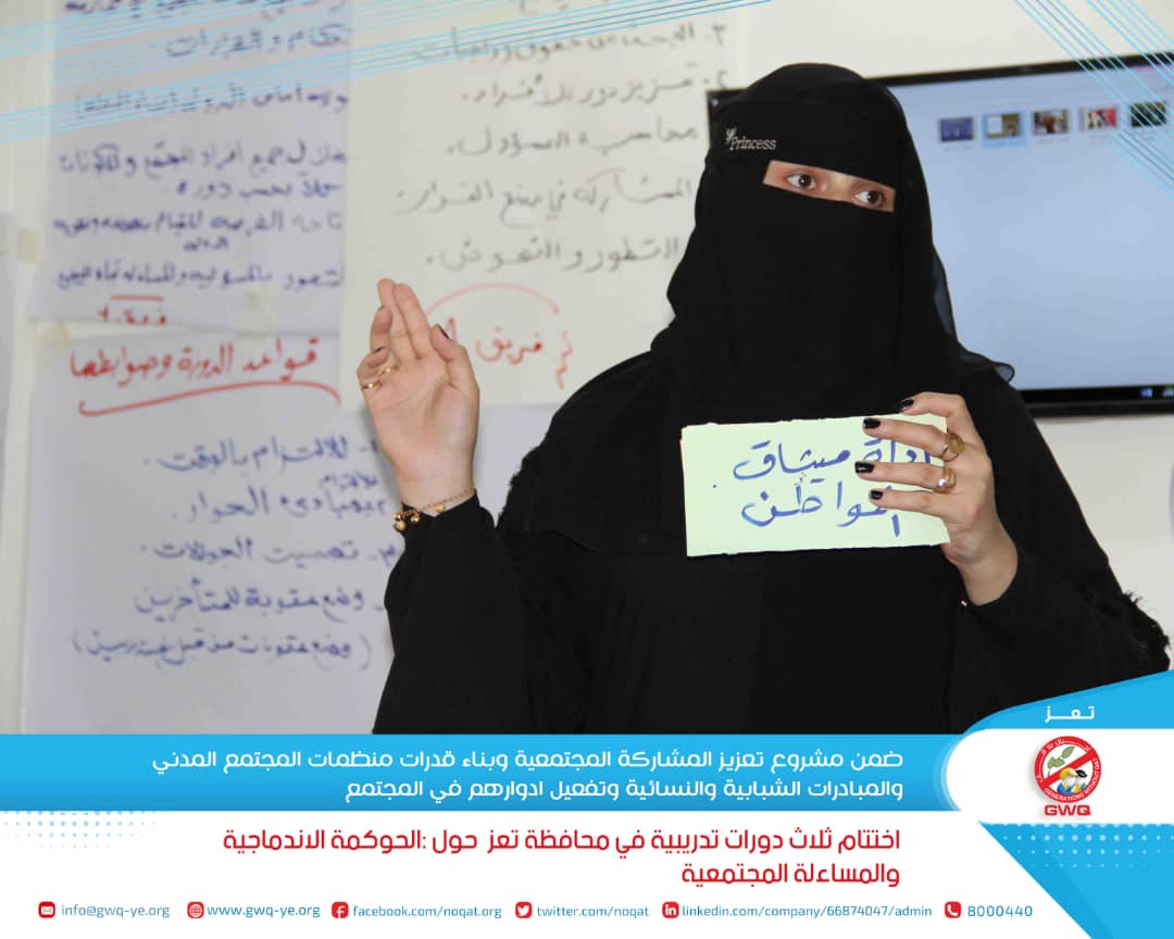 تعز...أجيال بلا قات تختتم ثلاث دورات تدريبية حول "الحوكمة الإندماجية والمساءلة المجتمعية"